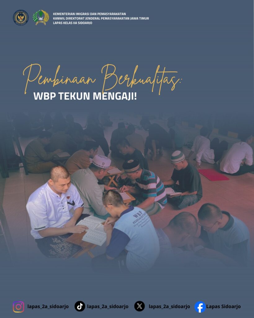 Kepala Lapas Kelas IIA Sidoarjo menyampaikan bahwa program mengaji rutin merupakan bagian penting dalam proses reintegrasi sosial WBP. “Pembinaan kerohanian sangat membantu membentuk karakter WBP menjadi lebih baik, lebih disiplin, serta memiliki kesiapan moral ketika kembali ke masyarakat,” ungkapnya.
