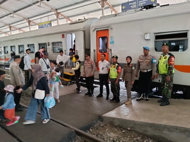 PASURUAN — Polres Pasuruan melakukan pemantauan arus keberangkatan dan kedatangan kereta api di Stasiun KA Bangil selama libur Natal dan Tahun Baru (Nataru) 2025, Minggu (28/12/25).