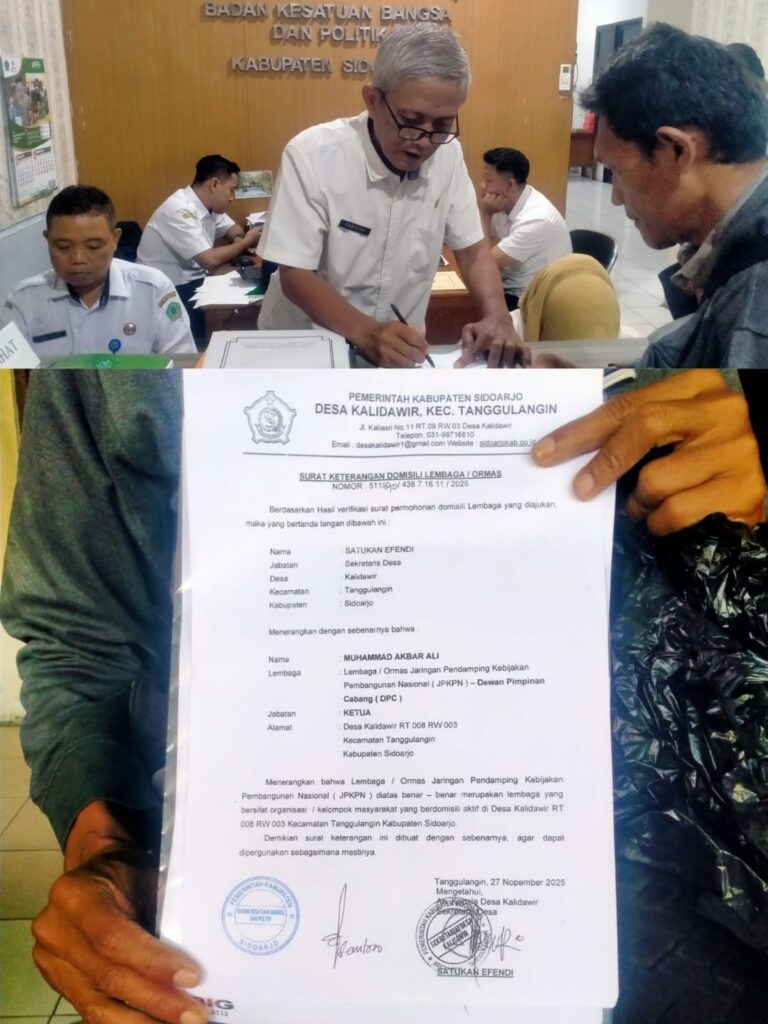 Sidoarjo, inforakyat24jam — Dewan Pimpinan Cabang Jaringan Pengawas Kebijakan dan Pemerintahan Nasional (DPC JPKPN) Sidoarjo resmi tercatat sebagai organisasi kemasyarakatan di Badan Kesatuan Bangsa dan Politik (Bakesbangpol) Kabupaten Sidoarjo. Legalitas ini menegaskan bahwa JPKPN memiliki dasar hukum yang sah untuk menjalankan program, kegiatan sosial, serta fungsi pengawasan kebijakan publik di wilayah Sidoarjo.