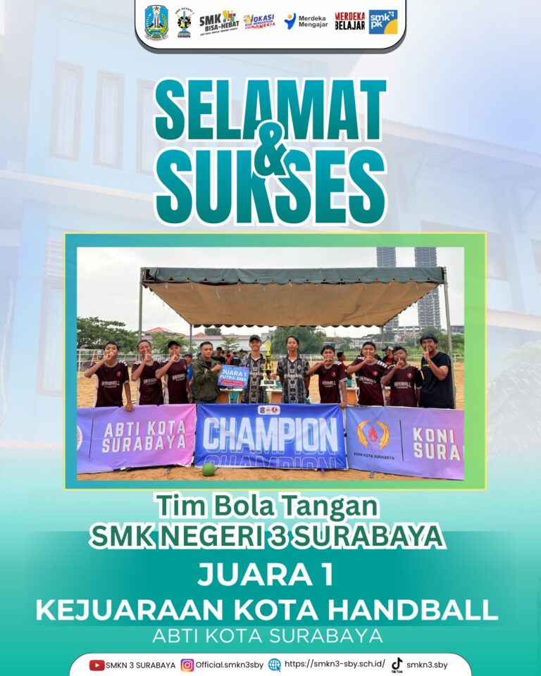 Surabaya,– Tim Handball SMK Negeri 3 Surabaya berhasil menorehkan prestasi membanggakan dengan meraih Juara 1 Kejuaraan Kota Surabaya yang diselenggarakan oleh Asosiasi Bola Tangan Indonesia (ABTI). Kejuaraan tersebut berlangsung di Lapangan Berkuda Universitas Negeri Surabaya (UNESA) pada 15–20 Desember 2025.